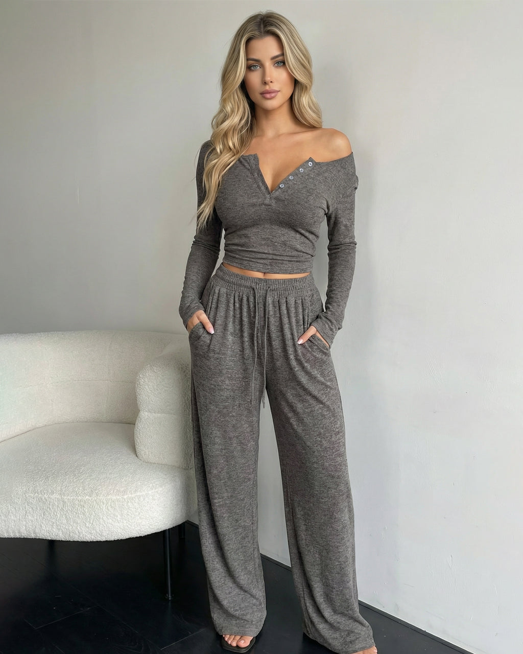 Half-Open Neck Cropped Top And Wide-Leg Pants Set
