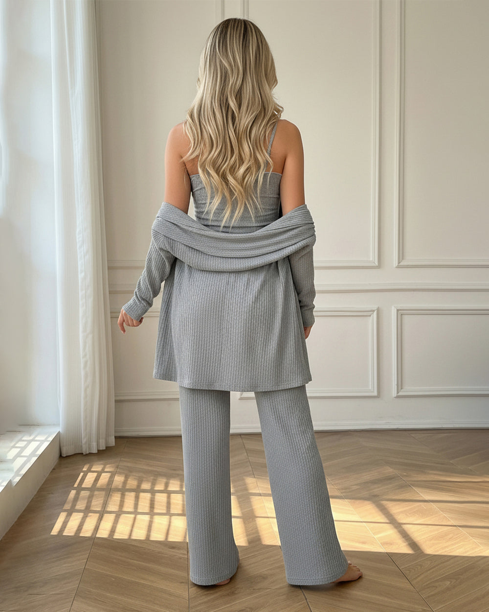 Ribbed Half-Open Neck Top And Wide-Leg Pants Set