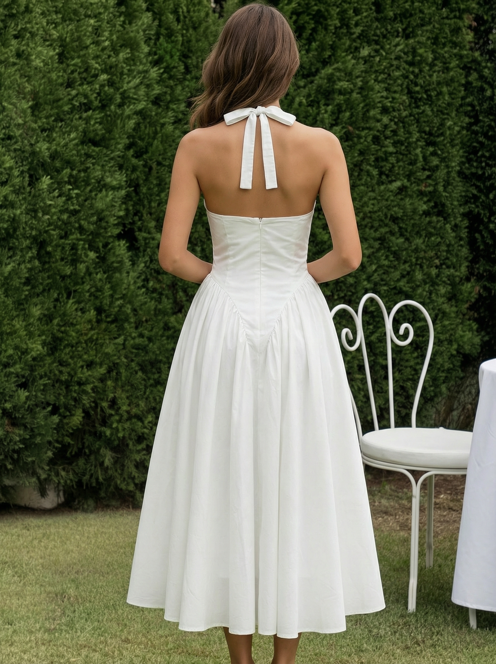 White Halter Deep V Backless Stretchy Midi Daily Casual Dress