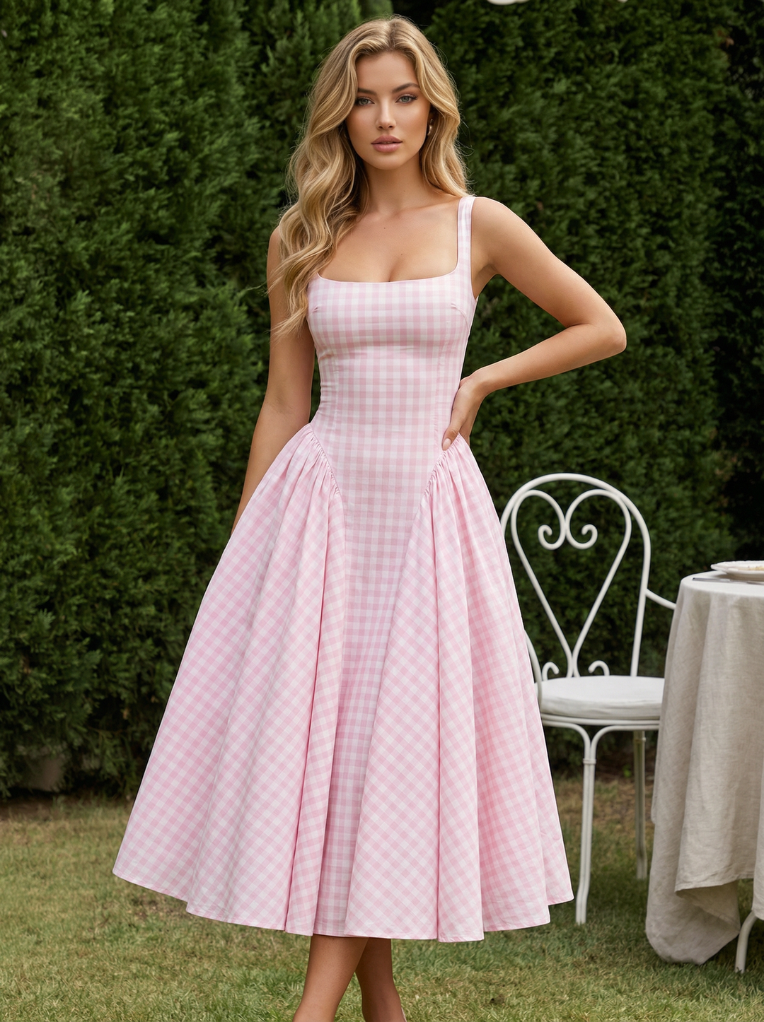 Pink Sweet Gingham Print Square Neck Stretchy Midi Daily Casual Dress