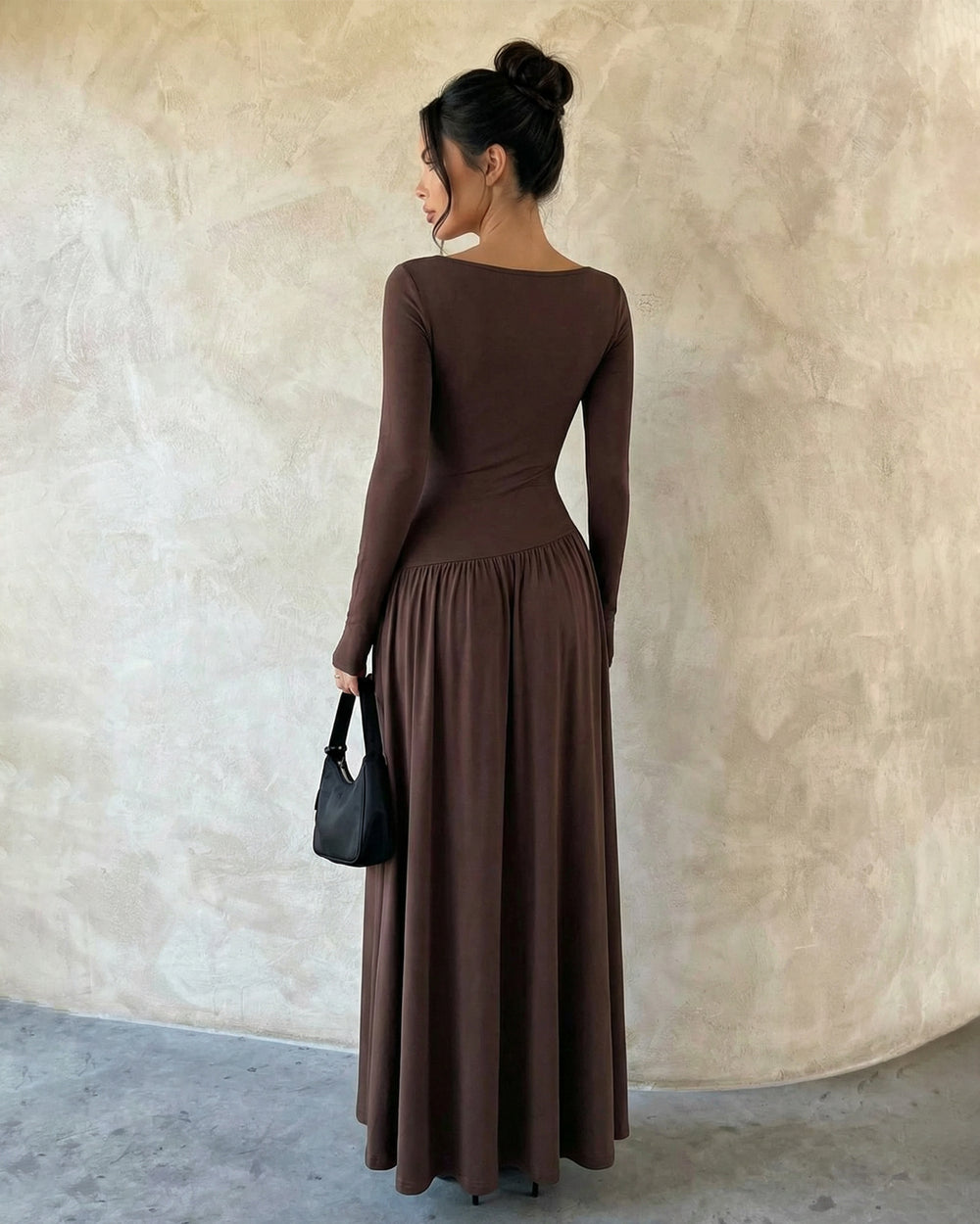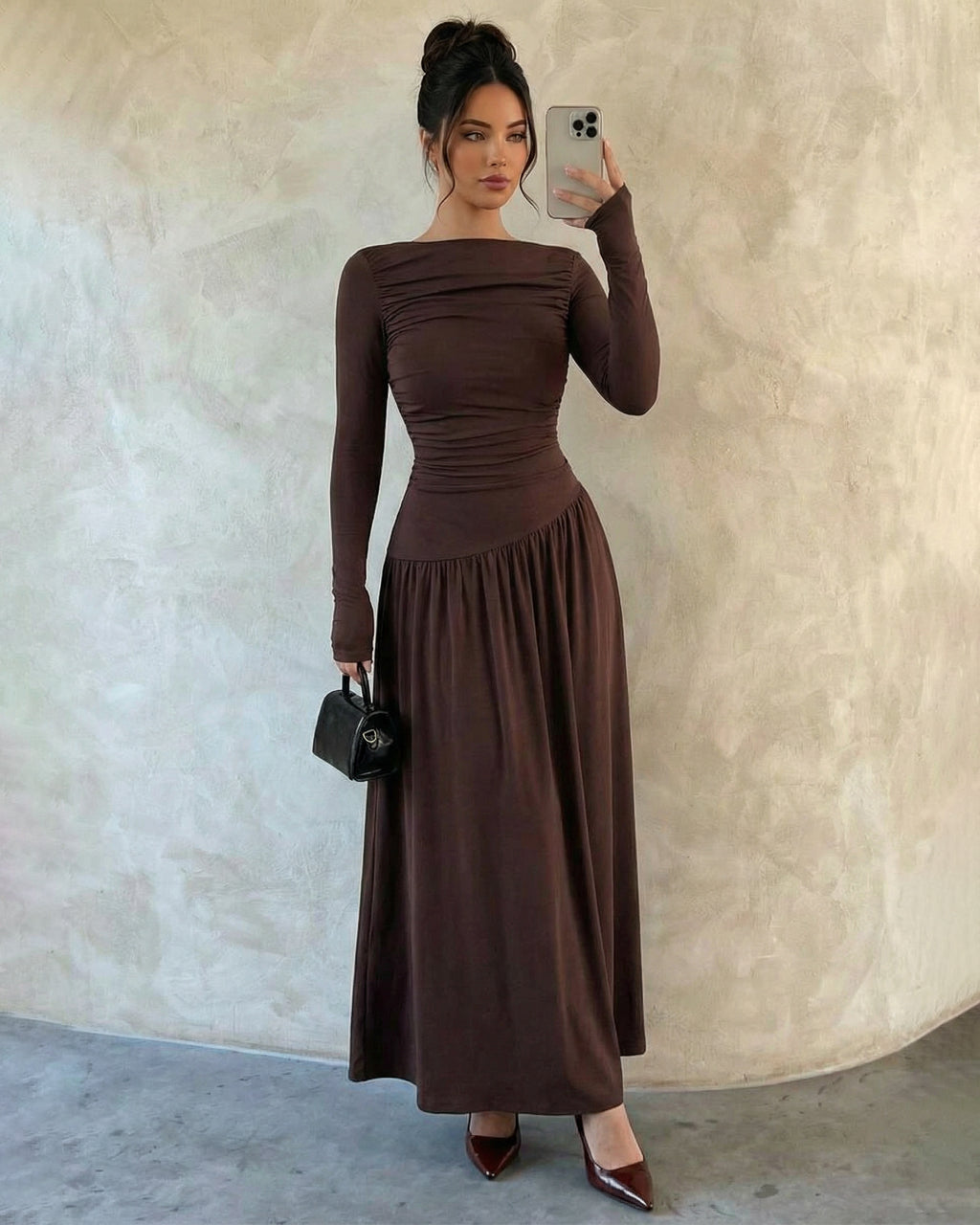 Brown Ruched Bodice Long-Sleeved Maxi Dress