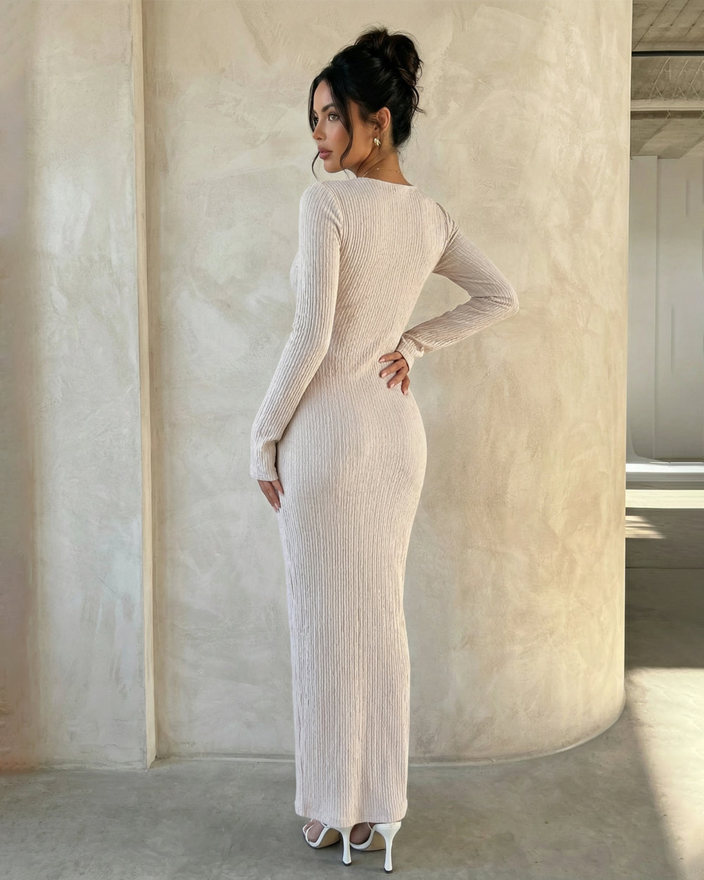 Beige Ribbed Knit Bell Sleeve Maxi Dress