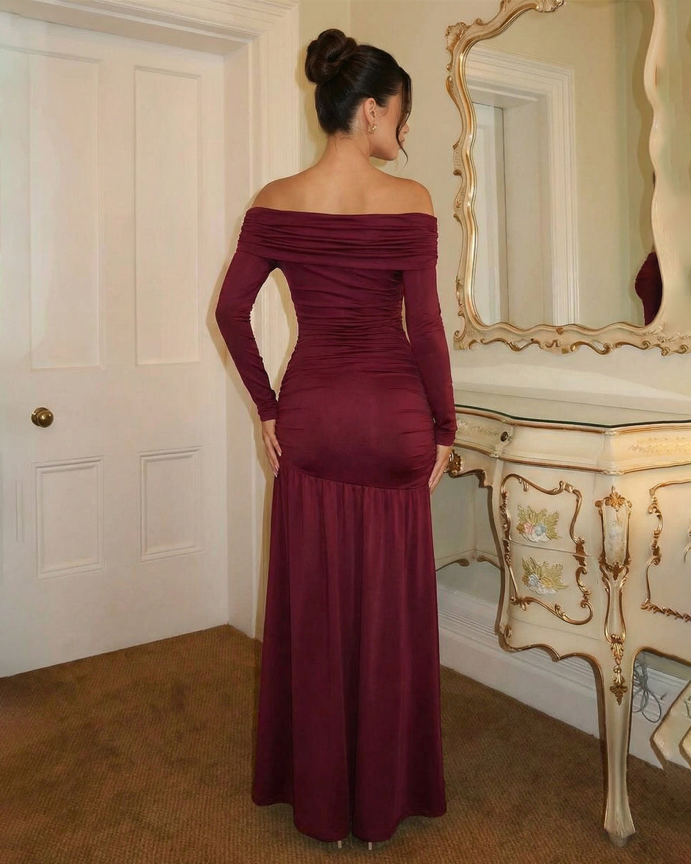 Burgundy Off-the-Shoulder Ruched High-Slit Maxi Dress