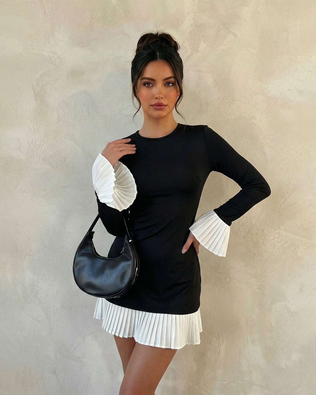 Contrast Pleated Hem Bell Sleeve Bodycon Mini Dress