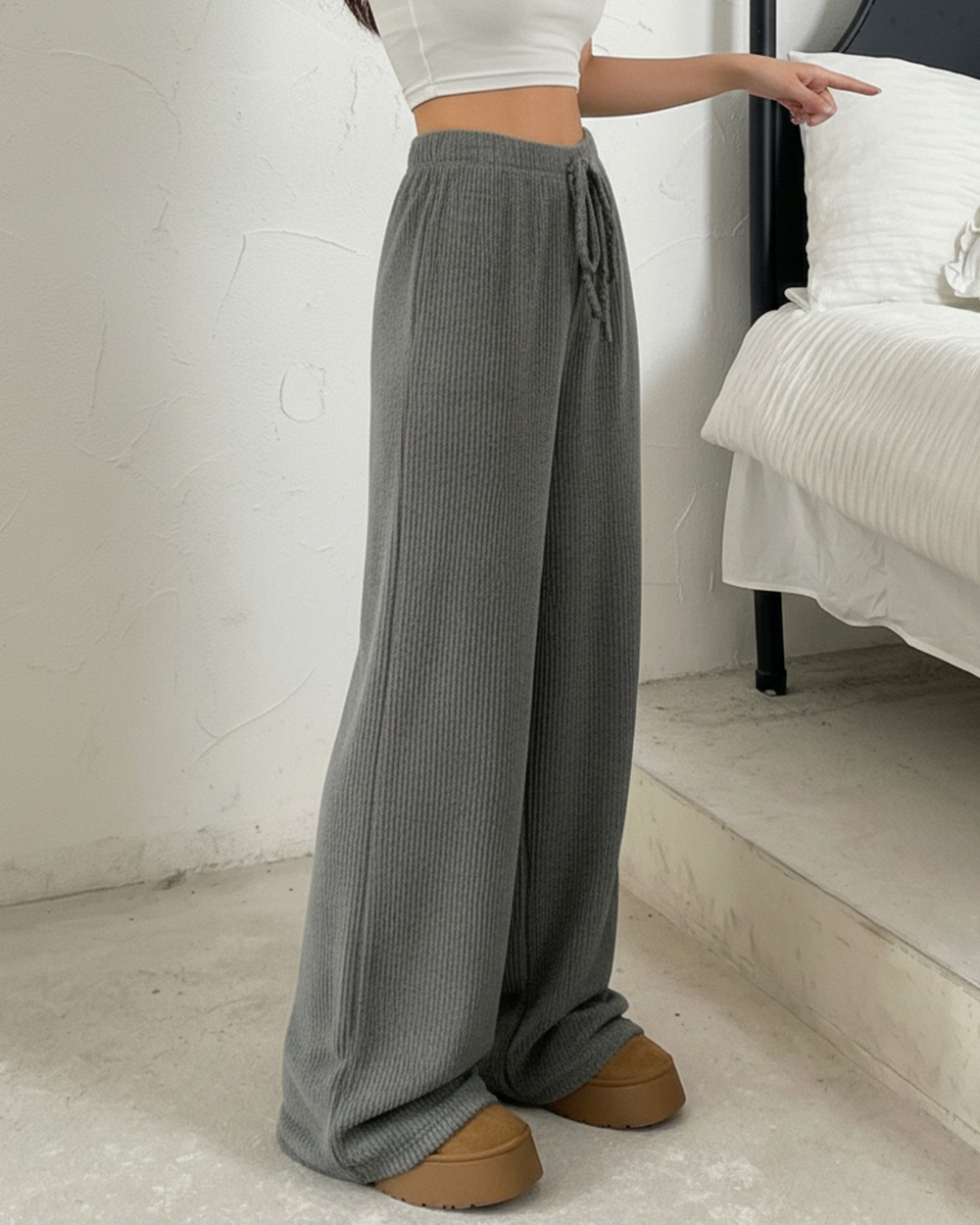 Gray Ribbed Drawstring Wide-Leg Pants