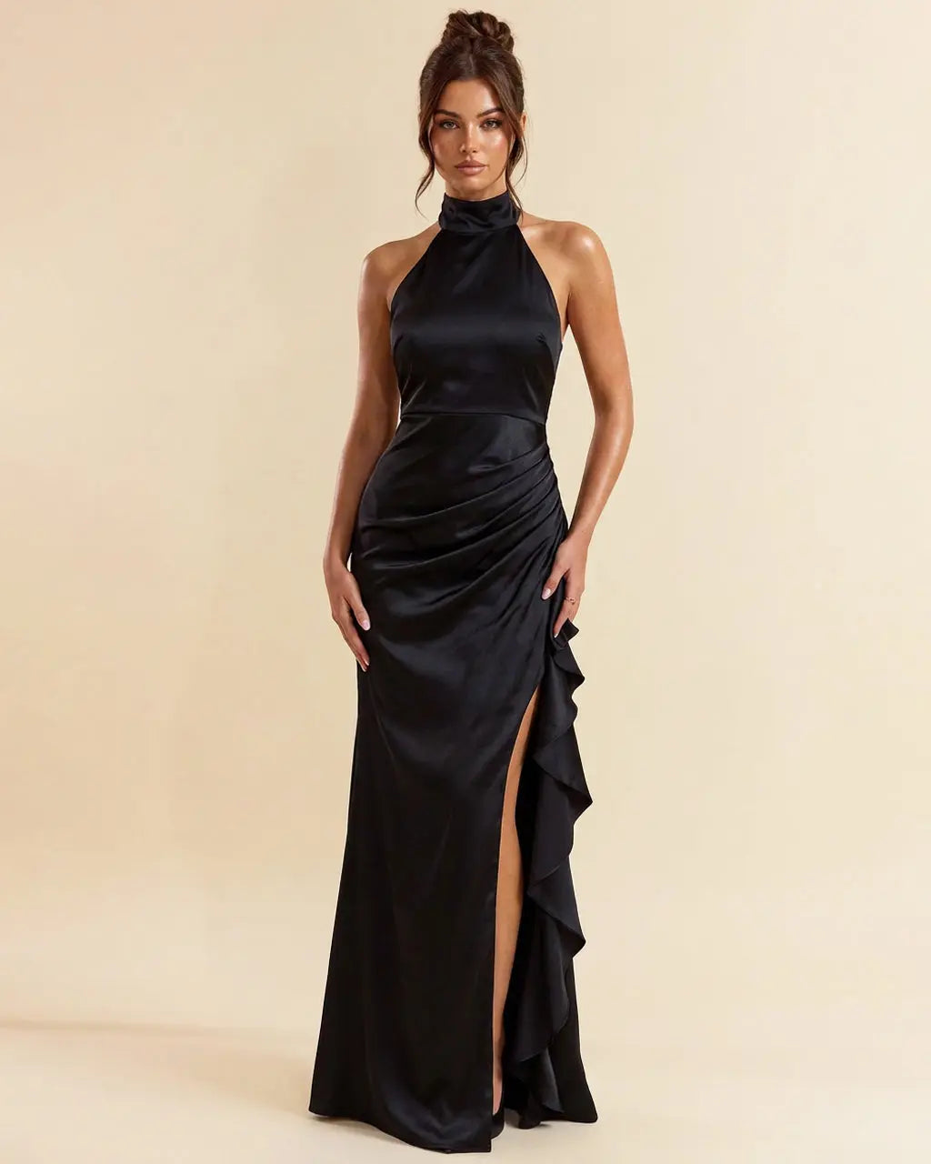 Black Satin Halter Neck Ruched Maxi Dress With Ruffle Hem SOLACE